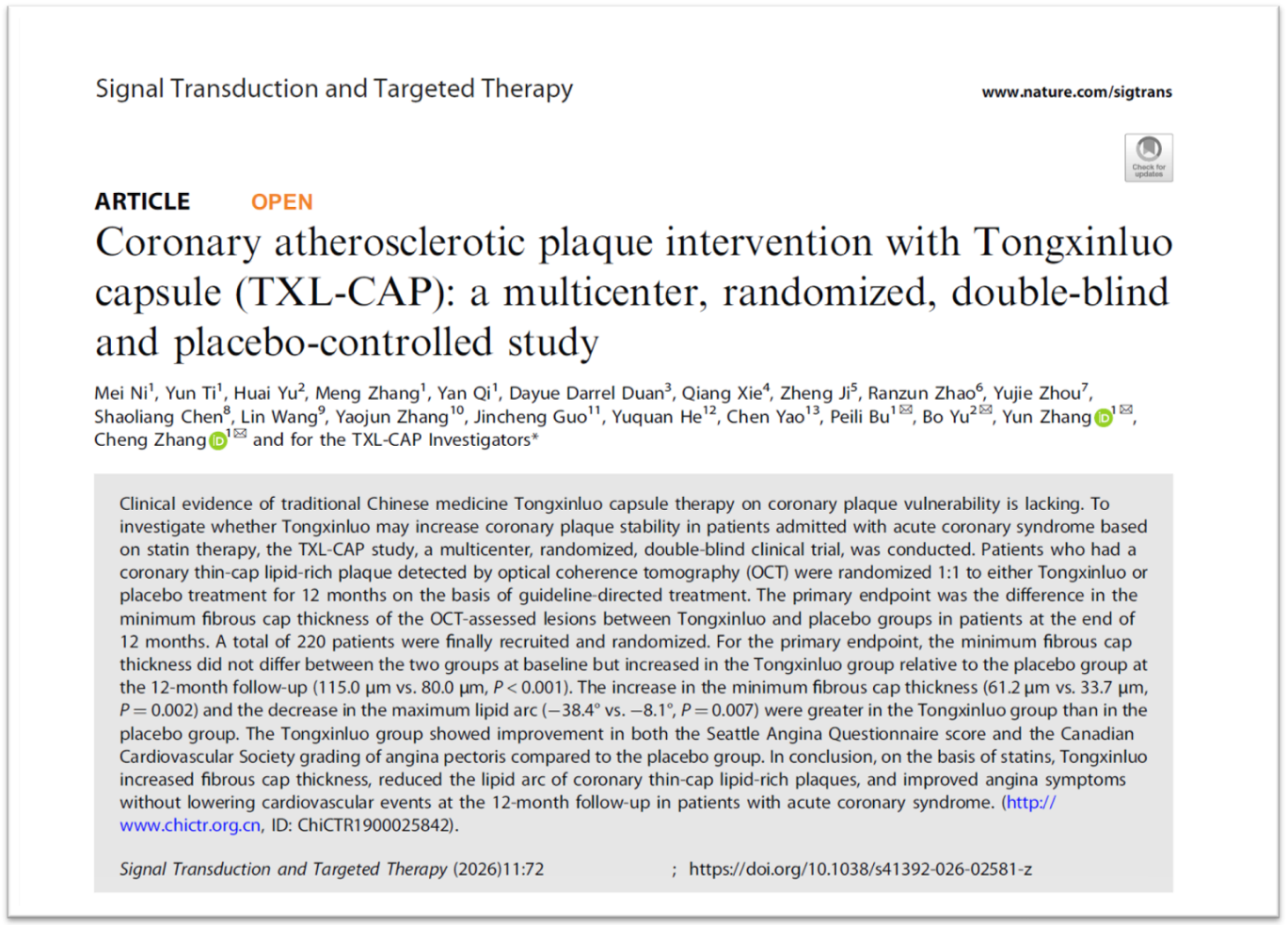 2月24日,《通心络胶囊干预急性冠脉综合征冠状动脉粥样硬化斑块的多中心、随机、双盲、安慰剂对照、平行对照临床研究(TXL-CAP多中心研究)》一文在线发表在Springer Nature管理的国际著名期刊《信号转导与靶向治疗》(STTT,影响因子52.7)上。该结果表明,基于他汀类药物等现代标准治疗方法的同心螺钉组合,可以显着增加急性冠状动脉综合征患者易损冠状动脉斑块的纤维层厚度,降低斑块的脂质曲率,改善心绞痛症状,为临床稳定冠状动脉斑块提供有效的治疗方法。通心络是以岭药业的专利创新中药,在预防和治疗方面具有显着效果。心脑血管疾病。急性冠脉综合征是严重威胁人类健康的心血管疾病,具有发病率、死亡率和致残率较高的特点。这是因为冠状动脉中的脆弱斑块不稳定,容易破裂。斑块破裂会导致血栓,从而导致心脏病或中风等严重后果。因此,即使广泛使用经皮冠状动脉介入治疗和强化药物治疗,一些患者的“残余心血管风险仍然存在”,并且长期心血管事件的发生率仍然很高。如何在现有护理标准的基础上进一步降低残余风险,是当前冠心病防治领域的关键挑战。 《通心络胶囊干预冠状动脉粥样硬化的多中心、随机、双盲、平行安慰剂对照临床研究》急性冠脉综合征中的c斑块”是国家重点研发计划项目“翠螺理论英伟理论心血管事件链引导系统干预”的子项目,由山东大学齐鲁医院张成教授(学术研究员)牵头,该研究由欧洲科学院院士团队、哈尔滨医科大学第二附属医院张云院士、卜培力教授、于波教授以及来自17家三级医院的团队牵头。研究小组首先对1607例急性冠脉综合征患者进行冠状动脉光学相干断层扫描(OCT)检查,选取符合纳入标准的220例患者,随机分为同心螺旋组和对照组。所有选定的患者均被确认患有疾病通过OCT检查确定冠状动脉斑块(定义为斑块纤维层厚度最小为100微米、曲率90°斑块脂质浓度),均接受指南推荐的标准介入治疗和药物治疗。其中,新罗组和对照组约93%的患者在使用他汀类药物,充分体现了“基于现代护理标准的干预措施的重叠”。治疗12个月后的结果显示,同心螺旋组纤维帽厚度平均增加61.2微米,对照组为33.7微米。前者几乎是后者的两倍,同心罗的效果具有良好的普适性。各组表现一致。不同年龄、性别、2型糖尿病、不同冠状动脉病变类型的亚组同时,通心络组冠状动脉斑块最大脂质弧平均降低(约-38°)。明显大于对照组(约-8°)。简而言之,斑块纤维层厚度的增加和脂质曲率的减小表明斑块更稳定并且不太可能破裂。这类似于皮厚馅小的饺子比皮薄馅大的饺子更不容易爆破。这些结果共同证明,基于这种现代钉子和其他标准治疗,结合同心螺钉,我们可以进一步增加易损斑块纤维层的厚度,减少脂质成分,并朝着“更稳定”的方向重塑斑块结构。此外,研究还发现新罗组患者的心绞痛症状与对照组相比明显改善,发现该药物是安全的。这项研究首次使用光学相干断层扫描,这是评估脆弱性的国际“金标准”斑块和高分辨率冠状动脉 OCT 图像作为切入点。研究发现,同心螺纹与急性冠状动脉综合征患者冠状动脉的脆弱性有关。我们首次提供了易损斑块稳定的高质量影像证据,并为同心螺纹降低急性冠状动脉综合征残余心血管风险的潜在机制提供了强有力的支持。这为国际上发现的心血管事件链条的介入环节中稳定易损斑块、减少心血管事件提供了有效的药物。此前,中国医学科学院阜外医院颜跃静教授牵头的“中国通新罗心肌保护治疗急性心肌梗死研究”证实,接受血管重建的ST段抬高型心肌梗死患者连续应用通新罗12个月西医规范化治疗显着改善了临床近、中、远期预后,心肌梗死发生率显着降低。为新罗提供基于证据的重要方法,以识别严重不良心血管事件的风险并改善冠心病患者的预后。这些研究的临床获益结果表明,通心络在冠心病尤其是急性冠脉综合征中的应用已逐步形成较为完整的循证医学证据体系,展示了中医药在急性冠脉综合征规范化治疗和综合管理方面的独特价值和应用前景。