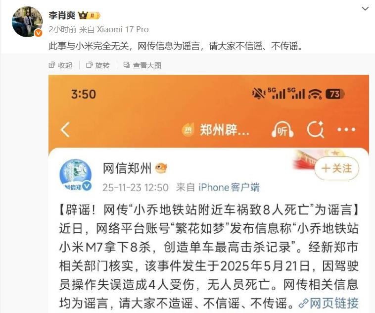 小米汽车副总裁辟谣“小米M7车祸致8人死亡”:与小米无关